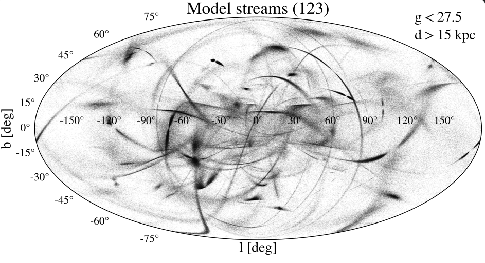 Using a model of how globular clusters form and evolve, in Pearson, Bonaca et al. 2024 we predict that galaxies like the Milky Way should have formed about 10,000 massive clusters. Most have since dissolved, but around 1,000 should still survive today as thin stellar streams. Only about 80 such fully disrupted GC streams are currently known in the Milky Way, which means we have likely found less than 10 percent of them. Future deep surveys, such as the Rubin Observatory’s Legacy Survey of Space and Time, could reveal hundreds more, even far out in the halo beyond a galactocentric radius of 15 kpc (see figure). These discoveries will provide a powerful way to explore dark matter substructure in the outskirts of the Milky Way.